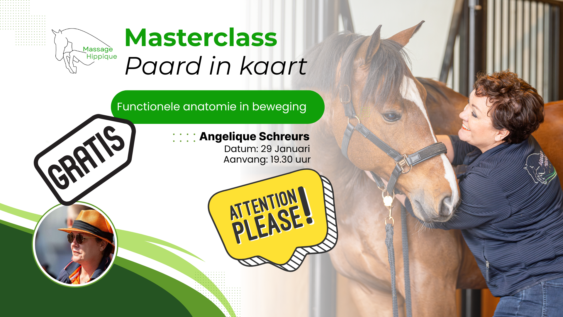 Je krijgt 1 uur masterclass + live Q&A. Aan het einde vertel ik kort wat Massage Hippique is en welke licentie of traject het beste bij je past.