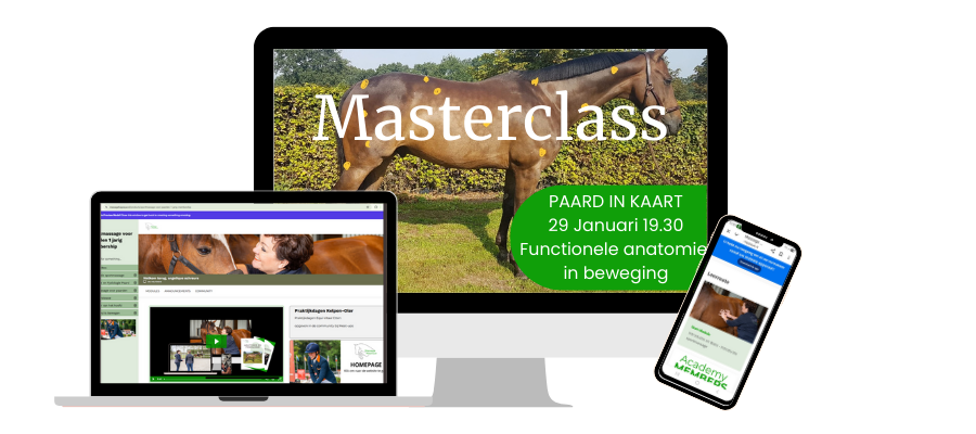 In deze masterclass laat ik je zien hoe je functionele anatomie koppelt aan wat je in beweging ziet. Geen ingewikkelde theorie om de theorie — wel inzichten die je meteen herkent in je eigen paard.